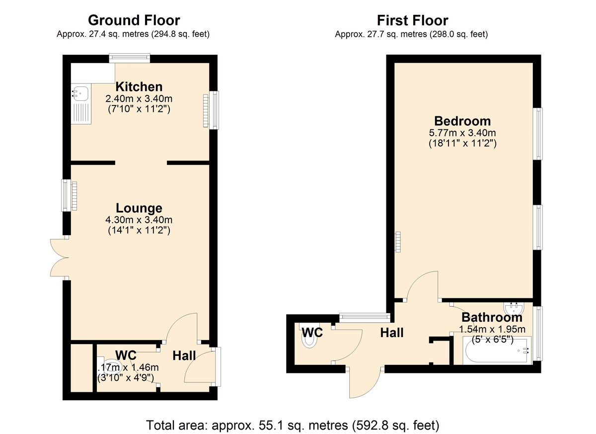 The existing accommodation is arranged over two floors and extends to approximately 55.1 sq. metres (592.8 sq. ft.), comprising a ground floor lounge, kitchen and WC, with a first-floor bedroom, bathroom and additional WC. The layout provides a clear basis for reconfiguration, subject to all necessary consents.